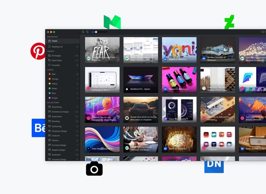 A platform to explore, discover, and organize digital design inspirations from multiple sources (online design communities) and your own local collections.