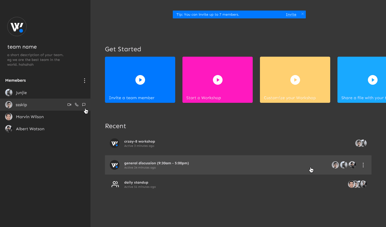 We decided to open up to 7 participants to join a workshop simultaneously. We picked the magic number of 7 according for our initial performance testing, and also because it is a good team size which could be fed with two-pizzas.